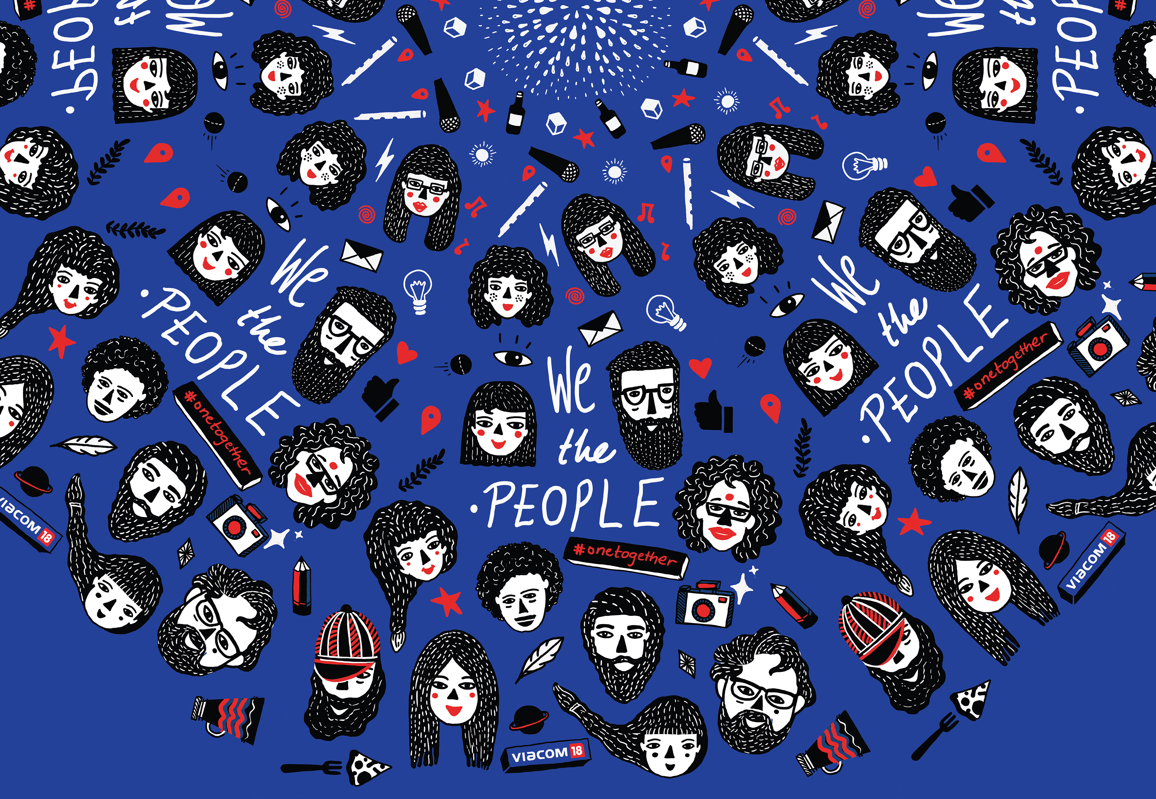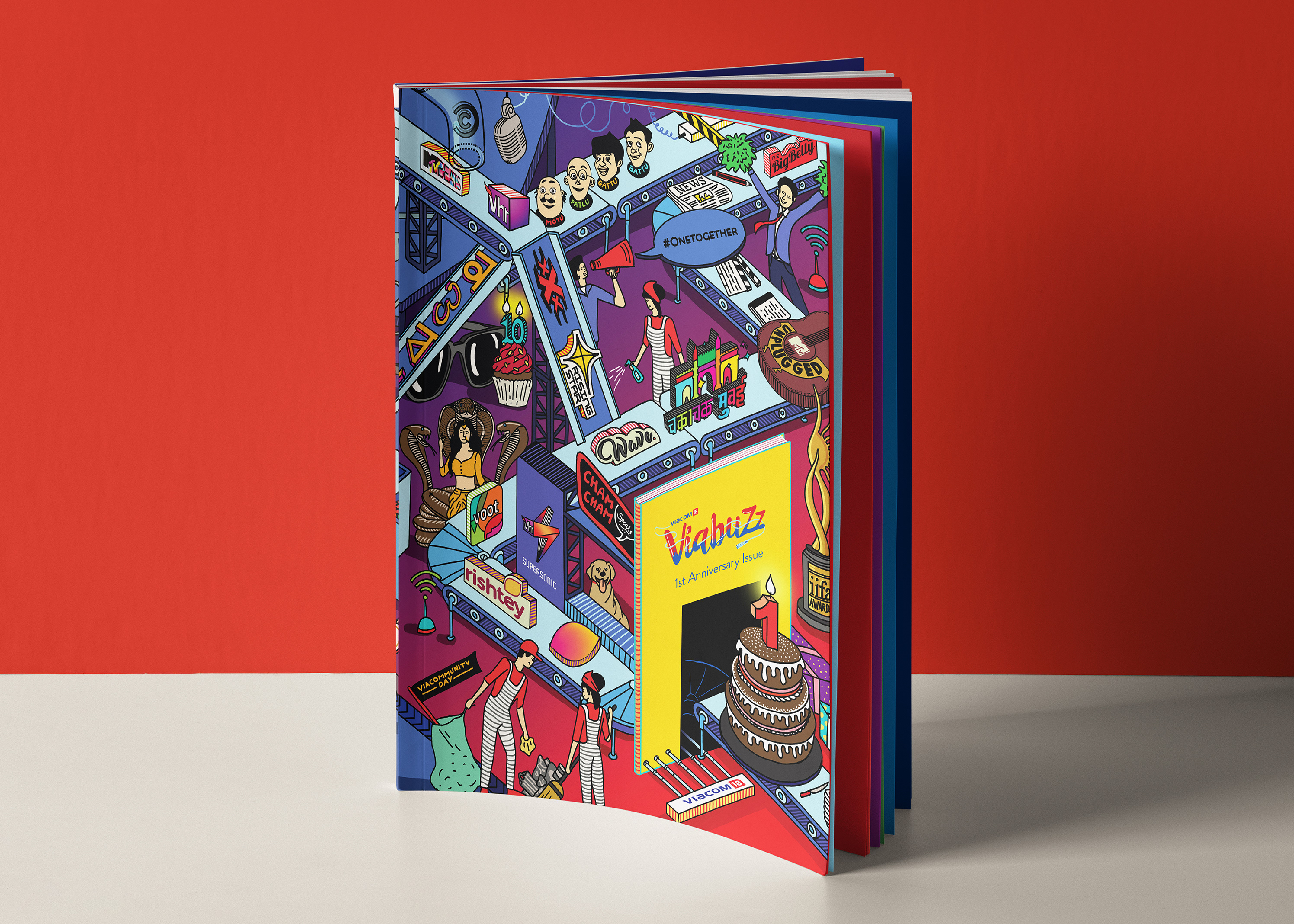 As one of the leading media and entertainment companies in India, Viacom18 believes that growth is driven by an inclusive culture that encourages innovation through engaged collaboration. They wanted to encapsulate the diverse ethos of the individual brands into the singular identity of the mother brand. The optimal way to establish this was to create a theme that celebrated and unified the two opposing identities – the individual and the universal – OneTogether and this umbrella was designed as a testament to this belief in the brand colors, black, white, blue and red.
